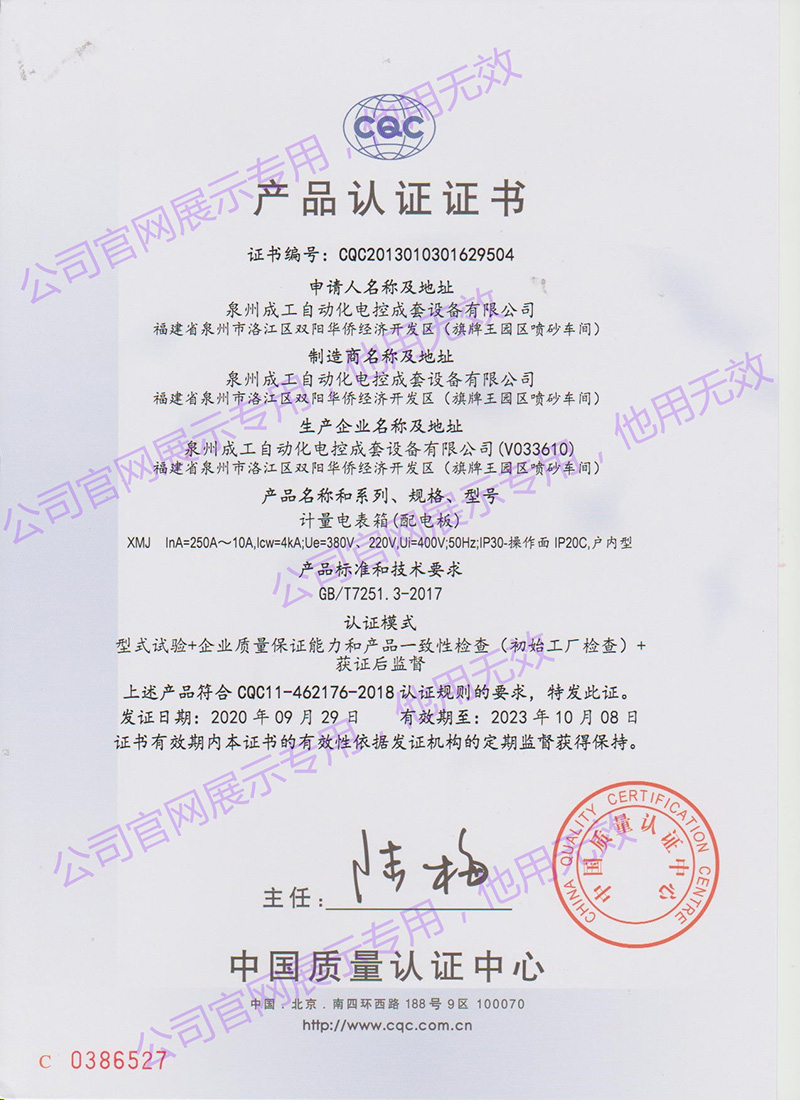 XMJ計(jì)量電表箱產(chǎn)品認(rèn)證證書 -