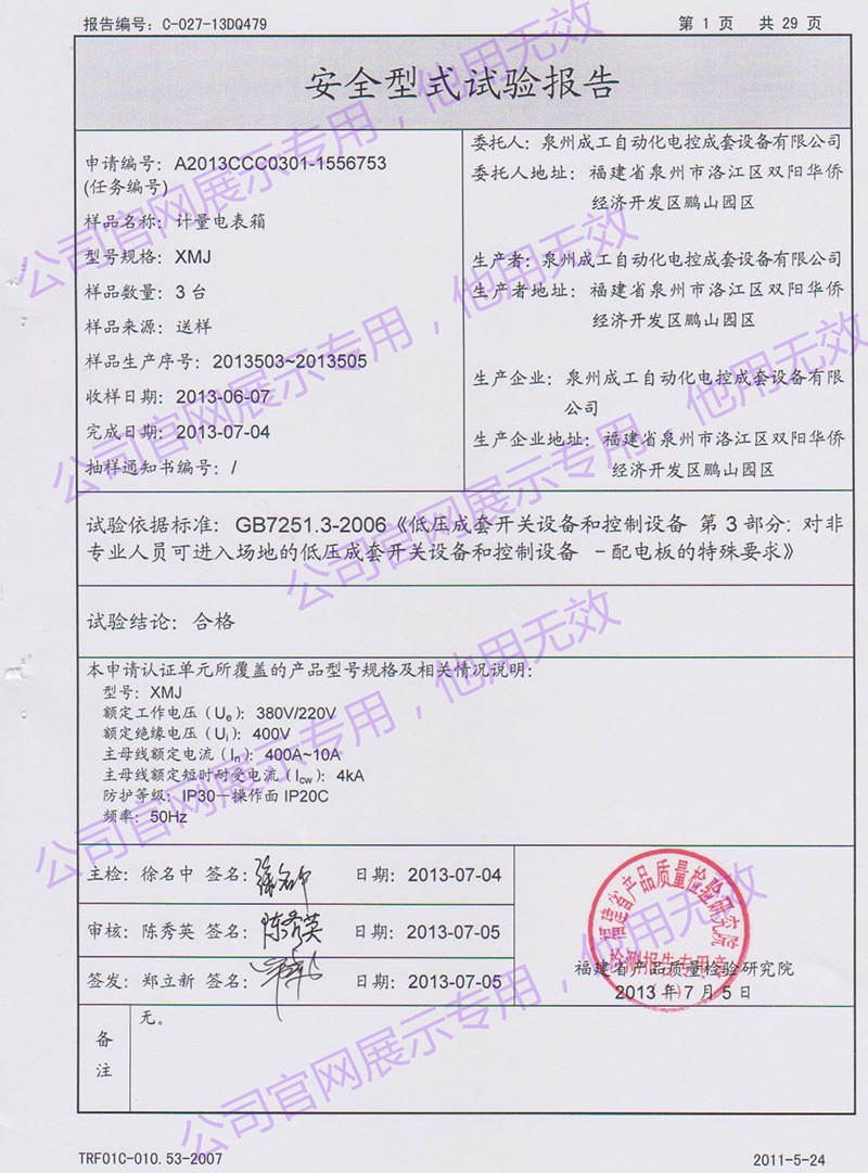 XL-21低壓動(dòng)力柜安全型式試驗(yàn)報(bào)告 -