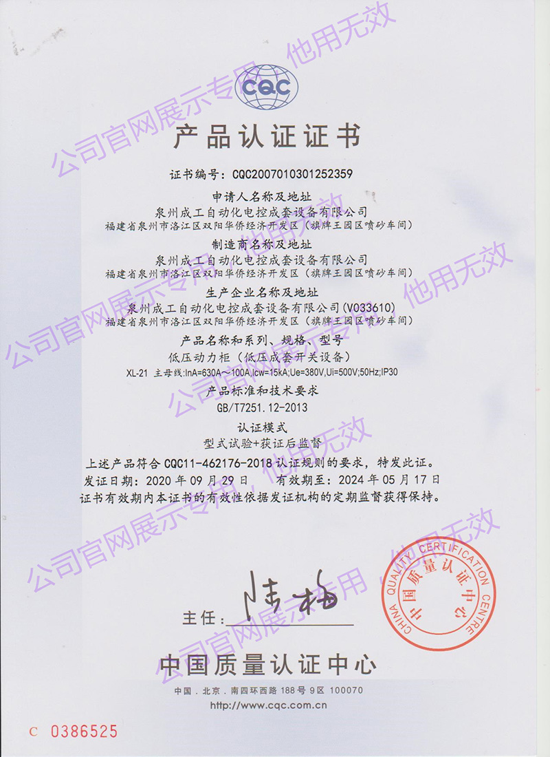 XL-21低壓動(dòng)力柜產(chǎn)品認(rèn)證證書 -