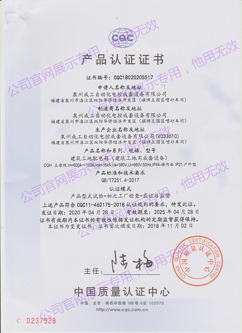 CGH建筑工地配電箱產(chǎn)品認(rèn)證證書 -